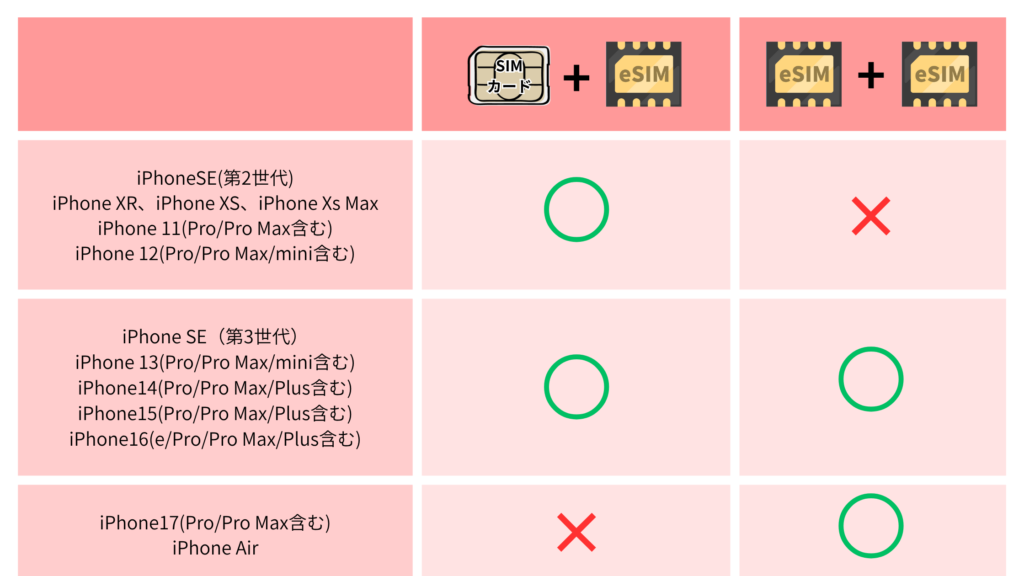 そして、2025年9月に発売されたiPhone17シリーズのように物理的なSIMカードスロットがなくなり、eSIM+eSIMの組み合わせで2回線を利用できる機種もあります。