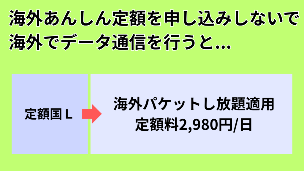 この場合、海外あんしん定額を利用開始設定するまでに利用したデータ通信は、定額国Lの地域であれば「海外パケットし放題」が適用されてしまい、海外あんしん定額Lよりも割高な通信料となります。