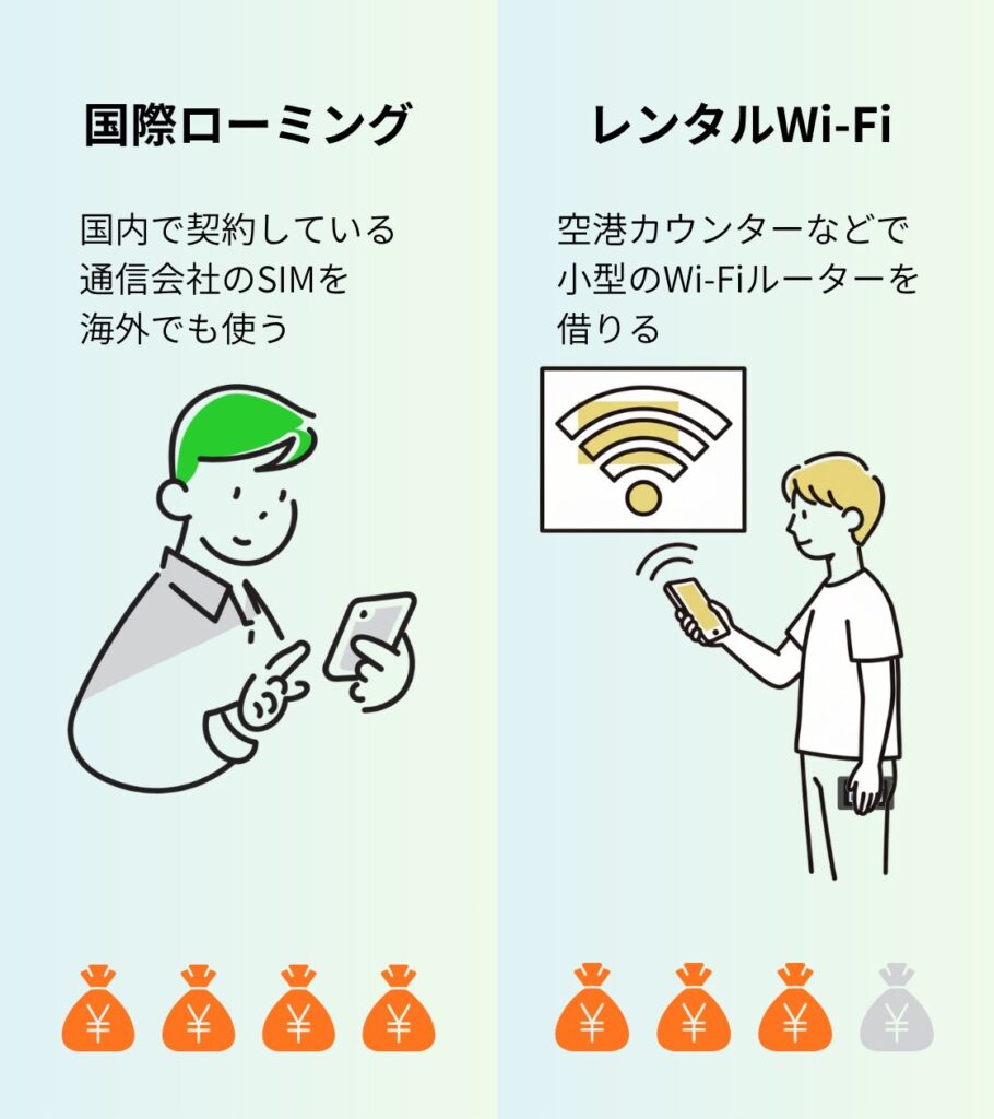 | レンタルWi-Fi | ・荷物が増える ・返却が必要 | ・ローミングに比べると安価 ・複数端末で利用できる | |
