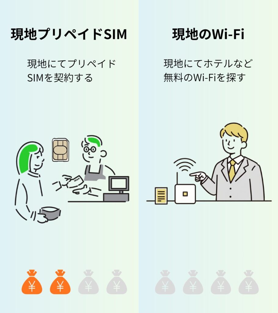 | 現地無料Wi-Fi | ・セキュリティが心配 ・場所が限定される | ・基本的に無料も多い |